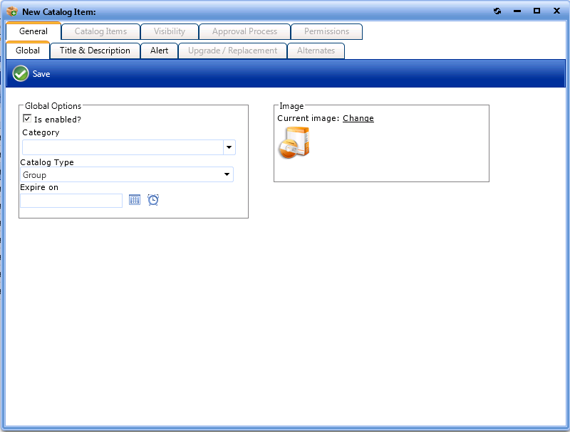 2. Under Catalog Management, select Create New Catalog Item > New Group Catalog Item. The General > Global tab of the Catalog Item Properties dialog box opens.