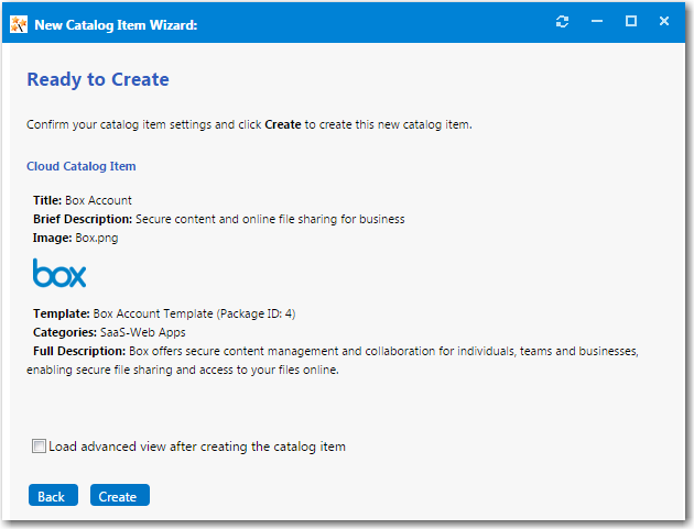 If, after this catalog item is created, you want to immediately open this catalog item’s Catalog Item Properties dialog box, where you can specify advanced settings, select the Load advanced view after creating the catalog item option.