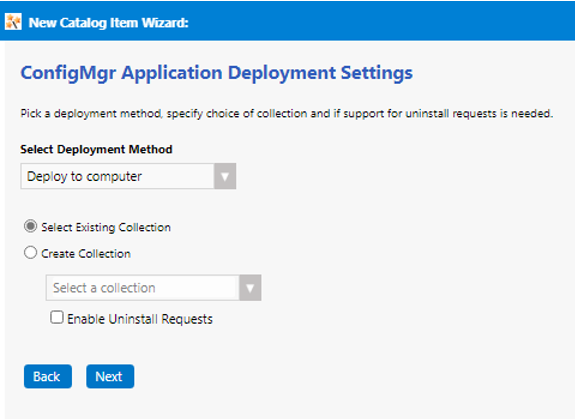 If you are adding a package from ConfigMgr, perform the following steps on the ConfigMgr Deployment Settings Panel when Enable selection of existing collection when creating/editing a catalog is enabled: