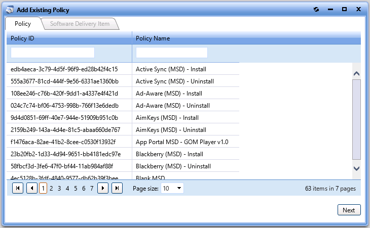 Select a policy and click Next, the Software Delivery Item tab opens.