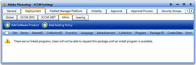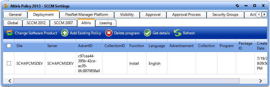 Click Add Program. The policy is now listed on the Deployment > Altiris tab.