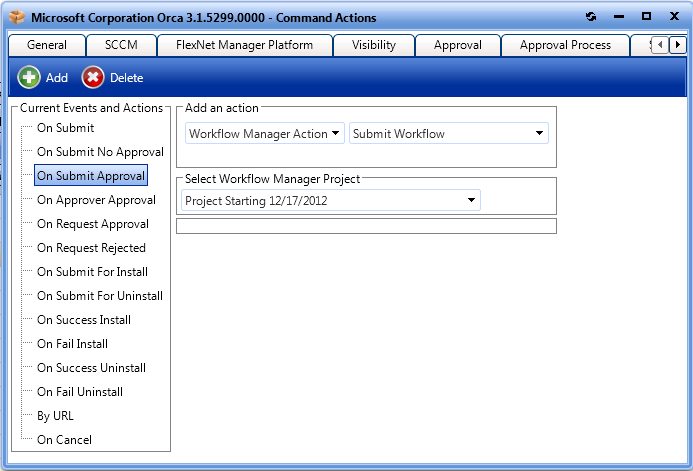 - In the Current Events and Actions column, select the event that you want to trigger the submission of a Workflow Manager workflow request (such as