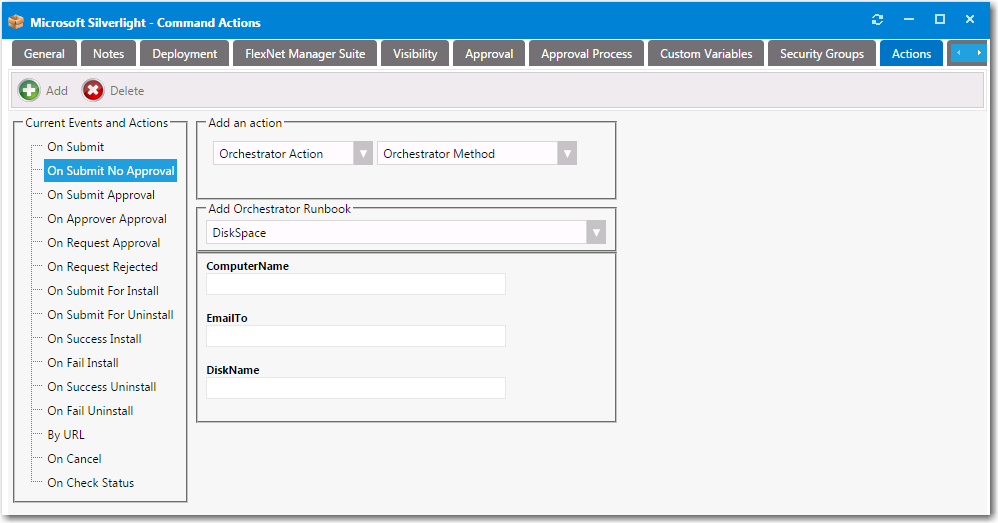 3. In the Current Events and Actions column, select the event that you want to trigger the submission of a System Center Orchestrator workflow (such as On Submit Approval or On Fail Install).