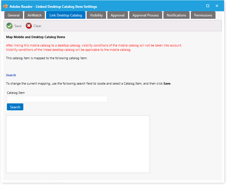 1. Open the Link Desktop Catalog tab of a mobile application catalog item’s Catalog Item Properties dialog box.