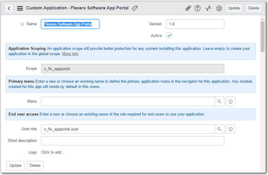 If you decide to modify the Flexera Software App Portal custom application in ServiceNow, you can extract that custom application as an update set XML file so that you can make it available on other instances of ServiceNow.