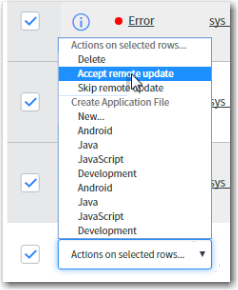 9. To resolve an error, select it, open the Actions on selected rows... menu at the bottom of the screen, and click Accept remote update.
