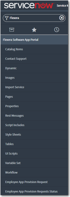 10. Click Commit Update Set. As soon as the update set is committed, if you enter Flexera in the ServiceNow search box, and you will see the following new items listed in the menu: